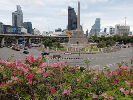 窓は全開。一部壊れていそうな窓も。ガタガタと音を立てながらバンコクの街を疾走していく。20分ほどで戦勝記念塔に到着。巨大なロータリーの一角で降車した。