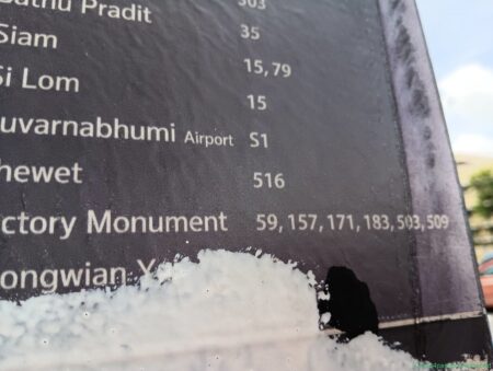そのA4バスが来た。ドンムアン空港からカオサン通りに行く定番バス。確か途中で戦勝記念塔を通過したはず。ドアが開いたので車掌に聞くと「停まらない。通過します」とのこと。それは具合が悪い。バンコク市内を走るローカルバスを調べるアプリもあるが、現地の情報を重視したいとしばし思案。確かカオサン通りの南側のバス停(民主記念塔の西側)にはルートを示したバス停があったはず。で、そちらへ向かう。
