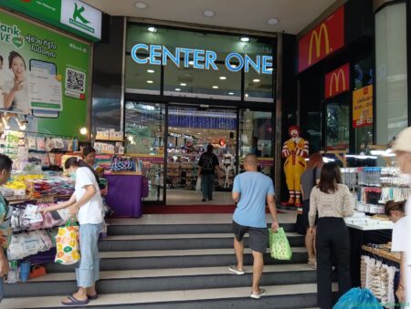 このロータリーはバンコク市内最大級らしく、大量のバスが次から次へとやってきては走り去っていく。周囲をBTSの電車が走り、高架式の歩道を歩くと景色が美しい。また周辺には巨大商業施設の「CENTER ONE」があり、マクドナルド、KFCのほか、日本の「かつや」なども入居している。