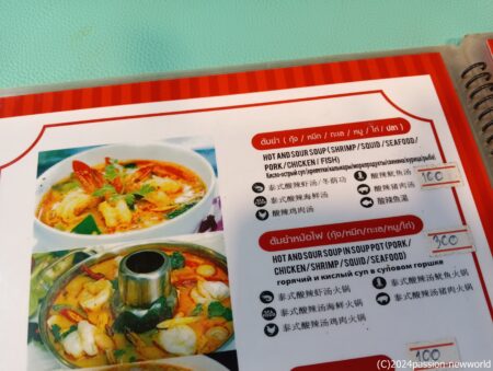 メニューを見ると、値段は据え置き。100バーツ(430円)のまま。とてもありがたい。