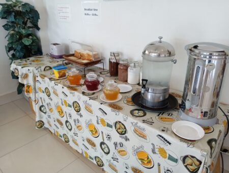 うれしいのは無料の朝食。食パン、トースター、ジャム3種類、バター、飲み物は冷水とコーヒー、ココアがあった。