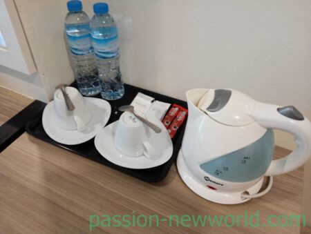 ミネラルウオーター2本、薄型テレビ、小型冷蔵庫。電気ケトルは壊れていたのでフロントで交換してもらった。WiFiはよく繋がる。