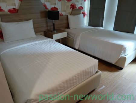 シングル2台。ベッドは固め。特に変な臭いはなく清潔感がある。白を基調とした壁もキレイだ。