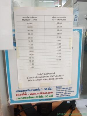 時刻表を確認。モーチット(バンコク北バスターミナルのこと)からパタヤへは午前5時から午後6時まで1時間ごとに出発。午前10時過ぎに窓口に行くと、11時発のチケットがとれた。料金は140バーツ。同10時半を回ると、11時発のバスチケットは売り切れており、次は12時発の表示がされていた。出発ギリギリだと次のバスを待たねばならないようだ。パタヤに向かう旅客がけっこういるということ。