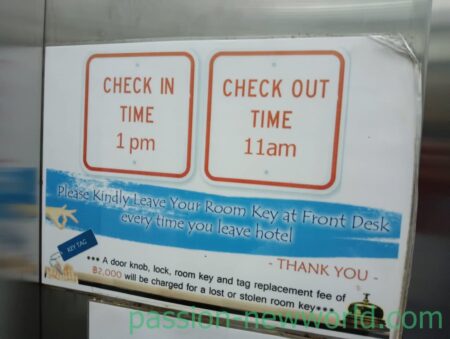 広くて整理整頓が行き届いているロビー。受付の女性に予約をしていることを告げると、「PSアパートメントの方ですね。玄関出て向かいです」とにこやか。最初、2階の部屋の鍵を渡されたが、上の階を希望している旨を伝えると、すぐに3階の部屋にしてくれた。鍵を持って表の道路を渡る。