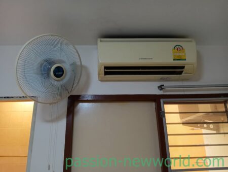 室内は非常にキレイ。髪の毛1本落ちていない。年月はたっているが、メンテナンスに気を配っていることを感じる部屋だ。エアコンの横に扇風機。網にからまりがちな埃はきれいに掃除してある。