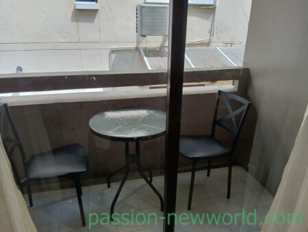 小さなベランダにはテーブルと椅子。利用する客はいるのだろうか。