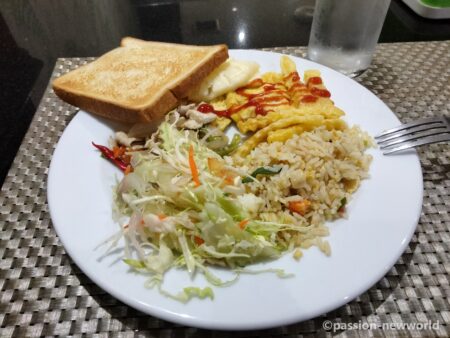 このホテルは無料朝食付きでエレベーターで1階に下りたら隣にあるレストランに移動する。メニューはチャーハン、食パン、サラダ類、卵焼き、豚肉と野菜炒め、フライドポテト、ウインナーなどがあり、ドリンク類もそろっている。