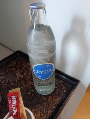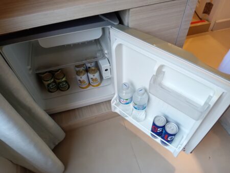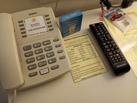 電話の横には避妊具。無料なのか有料なのか不明。無料でもらえるミネラルウォーターのほかに冷蔵庫には有料のミネラルウォーターが2本。間違えて有料ミネラルウォーターを飲んでしまったため翌朝、フロントで追加料金を支払うはめに。気をつけねば。