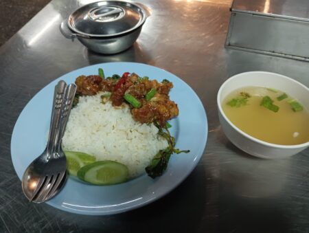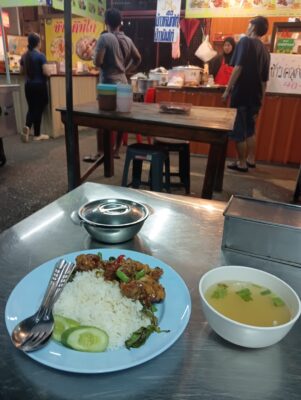渡船で対岸に渡ると船着き場にはオシャレなカフェや食堂があり、その先に進むと市場があり何軒か食堂がある。筆者は鶏肉のハーブ炒め(50バーツ)で空腹を満たした。シンプルに見えるが、スパイスがきいていてかなり旨かった。