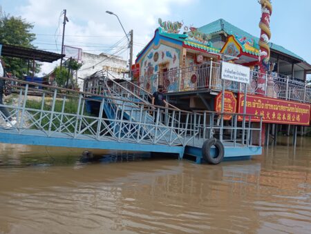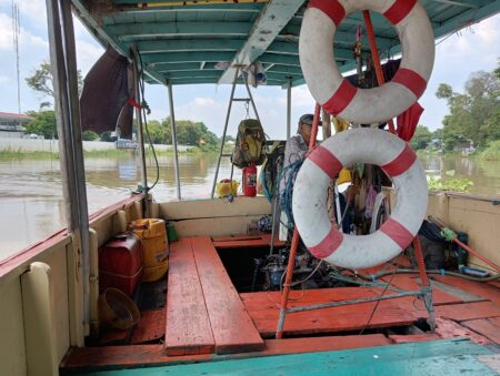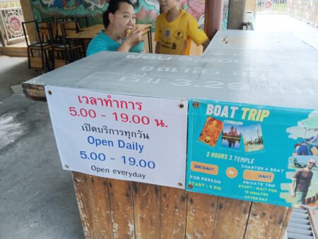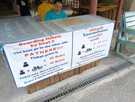 対岸の船着き場には運賃を支払うカウンターはない。アユタヤ駅側から渡る場合は先払い、遺跡群エリアからアユタヤ駅側にわたる際、下船時に運賃を支払うという仕組みだ。