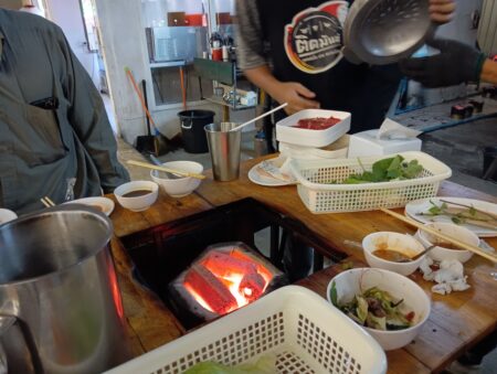 テーブルの上には各種のお肉や野菜がズラリと並ぶ。お腹がグーと鳴って仕方ないw。それにしても白菜の巨大な葉っぱがすごい。手でちぎって鍋の中へ。