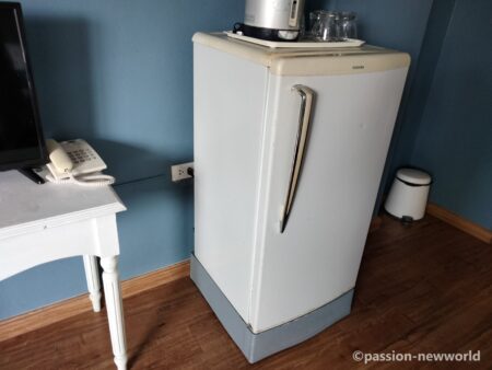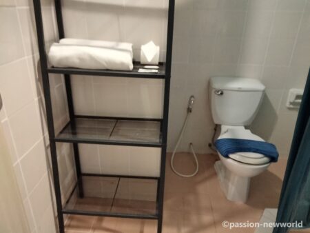 廊下にWi-Fiのアンテナが設置されていて部屋まで届くが奥の窓側に行くと少し弱くなる。トイレとシャワー室は分かれていないが、シャワーの周りにはカーテンがあり、さらに床には10センチほどの高さの囲いがあるため水でトイレがびしょ濡れになることはなかった。