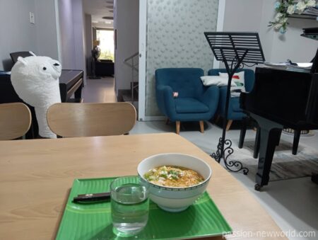 adodaで予約する際、「朝食込み」で予約したものの、翌朝出てきたのはインスタントラーメンでした。女性オーナーのピアノ部屋が会場。