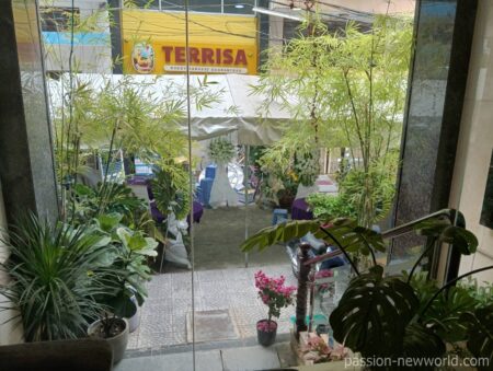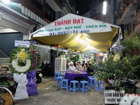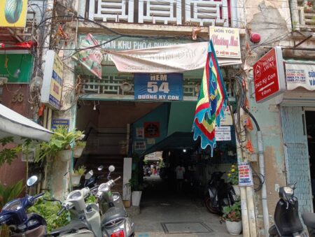 ホテルの住所は「54/13 Ki Con str, Dist 1, 1区, ホーチミン, ベトナム,」となっている。枝番最後の「54」を探しながら歩いていると、上の方に表示があった。この門をくぐって10メートル歩くと左手にある。この日はたまたま、ホテル前のスペースで葬式が行われており、多数の弔問客が集まっていた。そのためホテルの玄関がよく見えない状態。