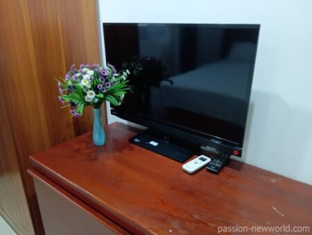 テレビ台の下に冷蔵庫がある。かなり古いタイプ。感動したのはトイレと浴室。木目調のシートが張られており、水はけが異常に良い。