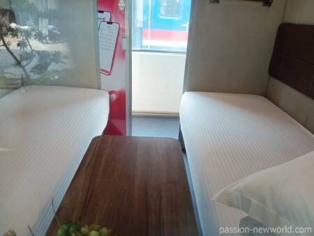 昼間の運行だが、座席車両はわずかでほとんどが寝台車両だ。昼間から寝ころびながら電車に乗るというのも楽ちんでいい。1室4人利用(ベッドは上下2段ずつ)と1室6人利用(ベッドは上中下3段ずつ)があり、4人利用の方が運賃は高くなる。