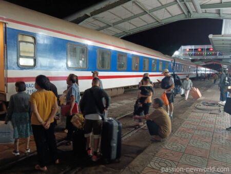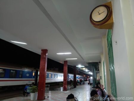 そして日没。列車の旅の後半は、ダウンロードしておいたディズニー+の配信ドラマをタブレットで3話分、計3時間視聴。すると、女性の車掌さんが何か合図をしてくれた。イヤホンを外すと「もうすぐニャチャンに着くよ」。車掌さんの手元にはスマホがあり、座席の状態、乗客の降車駅がすぐにチェックできるシステムになっているようだ。時刻表によると、ニャチャン駅出発は午後11時28分。およそ20分前の到着だった。線路沿いには欧米系バックパッカーと地元の人たちが大勢集まっている。これからダナンに向かうのだろうか。