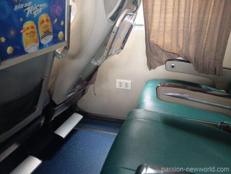 座席の横にはコンセント。これは充電に便利。ベトナムでは日本と同じAタイプのコンセントが使える。タブレット(USB Type-C)の充電に役立った。ホテルにあるドライヤーのプラグはCタイプの場合もあるので注意。