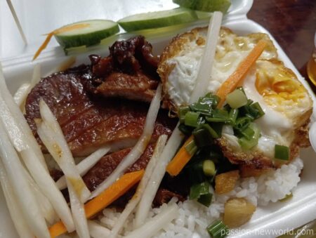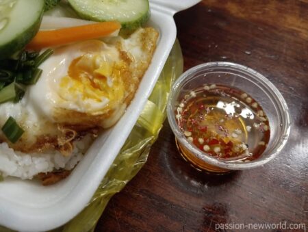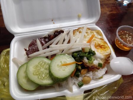 さて、注文しようかと思ったタイミングで店の男性が「テイクアウト?」と聞いてくれたので返事をした。ライスに揚げ豚肉、目玉焼き+少々の野菜で5万ドン(約300円)。