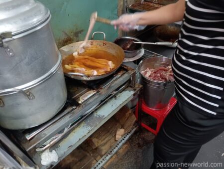 以前から気になっていたこの屋台。何を作っているのか良く分からなかったのだが、この日は怪しまれないように少しだけじっくり見ることにした。奥の女性はフライパンになみなみと揺れる油の中に豚肉の固まりを入れて「ジュワーッ」と盛大に揚げている。コンロの横には目玉焼きが10数枚。ご飯が入っていると思われるジャーも確認できた。