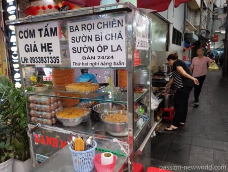 上のベトナム語の意味は「揚げた豚バラ肉、豚皮、豚リブ、目玉焼き」「24時間販売」「毎週月曜休業」。