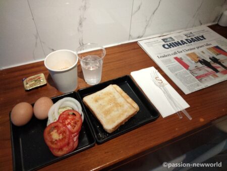 こちらのホテルは朝食無料。パンが数種類、オニオン、トマト、ゆで卵、バター、ドリンク類も充実している。