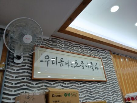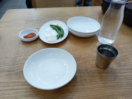 テーブルの上には白菜キムチとカクテキが入った大型の壺。自由に食べられる。牛丼屋の紅ショウガと同じ要領だが、もちろんこちらの方がボリューム満点。