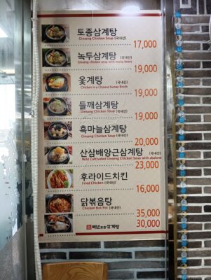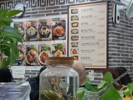 奥の方に1つテーブルが空いており、店員さんが手招きで「こちらへ」と合図。お目当ての「土種参鶏湯」(1万7000ウォン、約1700円)を注文。