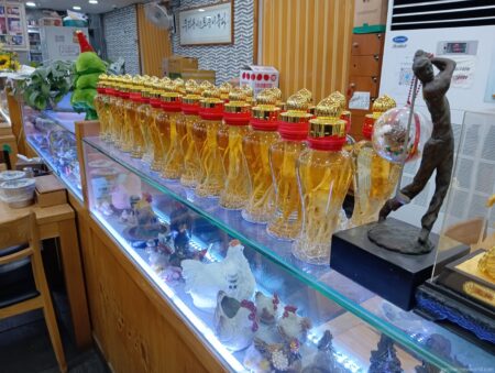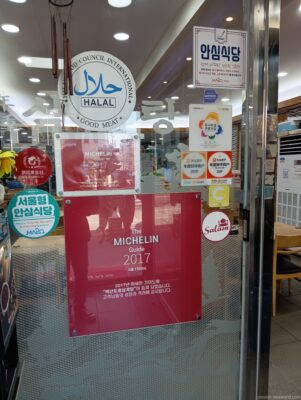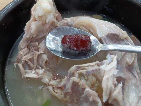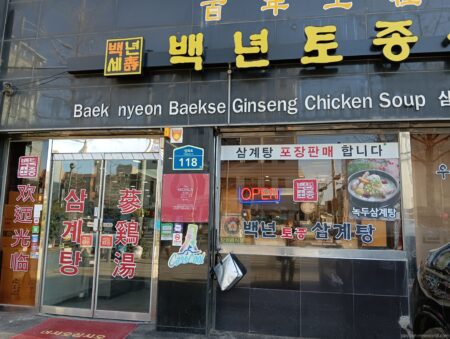 ソウル・弘益大学周辺の繁華街から少し足を延ばして約5分。大通り沿いに大人気の参鶏湯屋がある。連日、中国人観光客の団体や欧米系グループが訪れ満員御礼状態だ。混雑を避けるため午後2時過ぎに訪問するとまだ客席は満席状態。ミシュランに選ばれたこと、ハラル対応していることが人気の大きな理由だろう。その名も「百年土種参鶏湯」。
