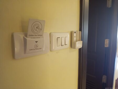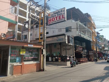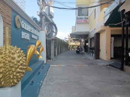 バーが密集するLKメトロから徒歩5分。ソイブアカオから少し入った路地にある中級ホテルがゴールデンシーホテル(Golden Sea HOTEL)だ。この看板に気付かないとうっかり通り過ぎてしまうから注意。
