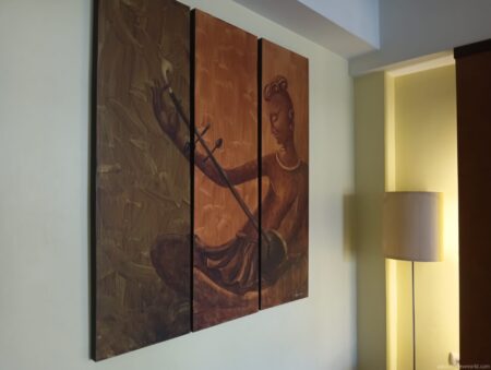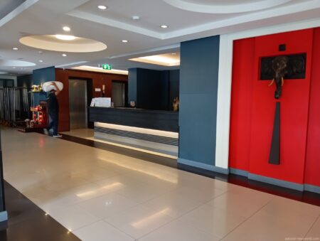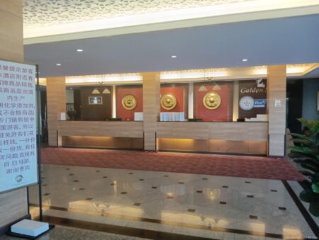 部屋は2階。agodaで予約の際、高層階を希望したが、シングル客は下の階になるようだ。奥のフロント前にはオリエンタルな雰囲気のソファと椅子。馬の造形物が骨みたいで少しひいたが、許容範囲だw