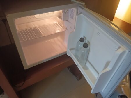 冷蔵庫の中は清潔。ミネラルウォーター2本。