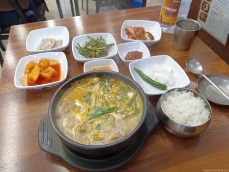 ぐつぐつと煮えたスープの中には具材がたっぷり。豚肉もたくさん入っている。おかず類はキムチ、カクテギ、セリのキムチ、青唐辛子、タマネギ、ゆで豚のスライス。調味料として味噌も添えられている。濃厚な豚骨スープながらしつこくはなく味はさっぱり。脂身がほとんどないからだろう。辛めの味噌を入れて味変。たまらない旨さだ。とにかく豚肉の量が多くお腹いっぱいになる。