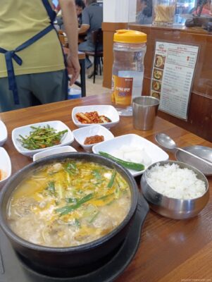 混雑する時間帯を避けて午後3時頃に入店。正面入り口入って左側の窓側は、おひとり様用のテーブルがあり、その隣の2人席も空いていれば座れる。豚肉料理の専門店でメニューは豊富。名物は店名にもある「スンデ」のようだ。