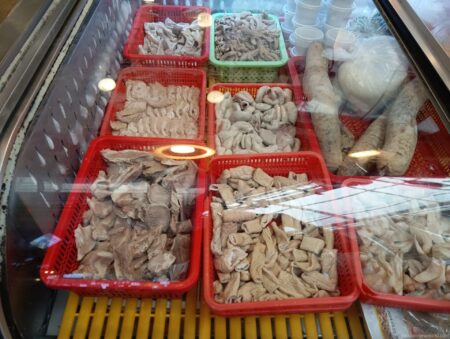 スンデとは韓国の伝統料理で豚の血やもち米、白っぽい唐麺(タンミョン)、ネギ、生姜、ニンニク、ハーブ類などの香味野菜を混ぜ合わせた具材を豚の腸に詰めて蒸したり茹でたりしたウィンナーのような形状。他にさまざまなモツ類の料理もそろっている。