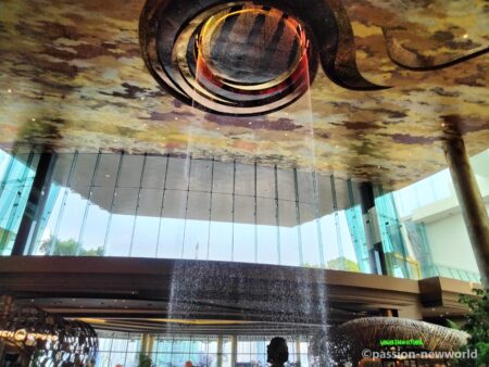 このモール最大の見どころは最上階にある人工の巨大滝。天井に設置された宇宙船のような機器の間から円状のまま水が放出される。水量の調節によって水滴の固まりがさまざまな模様に変化するという買い物客仰天のショーが繰り広げられている。多くの客が珍しそうにスマホを向けて写真を撮っていた。一時の清涼感を味わいたいのならぜひこちらへ。