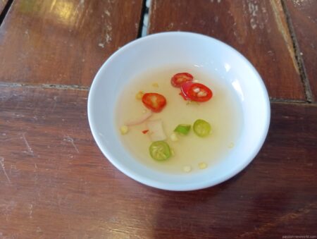 唐辛子入りナンプラーで味変。濃いめの味付けで旨さ倍増だ。