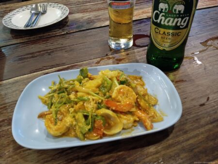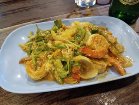 エビはプリプリ。それほど辛くはない。オニオンと空心菜のような野菜がよいアクセントとなっておりビールがすすむ。