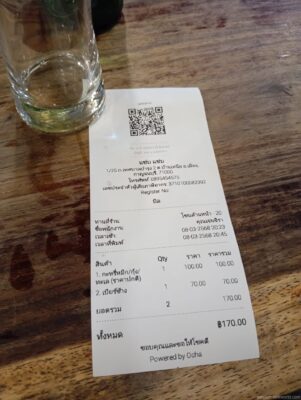 お会計は170バーツ(約750円)。エビの量が多くけっこう食べがいがあった。コスパ最高だ。