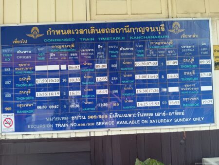 カンチャナブリ駅を14時43分発、トンブリ駅には17時40分着だ。