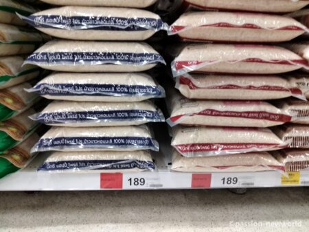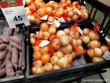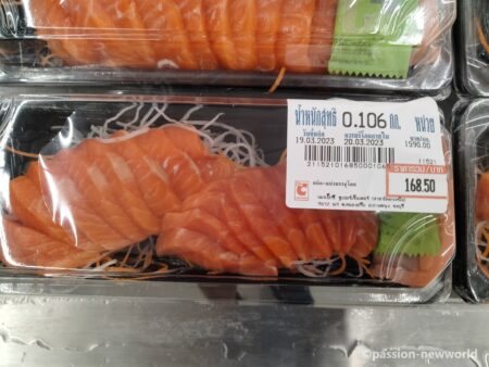 サーモン刺身パック168.50バーツ(674円)、焼き魚49バーツ(196円)、鶏卵10個入りパック63バーツ(252円)、缶ビールChang320ml33バーツ(132円)、同大瓶53バーツ(212円)、ナンプラー700ml29.50バーツ(118円)、袋ラーメン5個入32バーツ(128円)、タイ米5キロ189バーツ(756円)、鶏丸焼き1パック129バーツ(516円)、ポークハム1パック80バーツ前後(320円)、キャベツ1玉60.75バーツ(243円)、玉ねぎ5個入り45バーツ(180円)などなど。