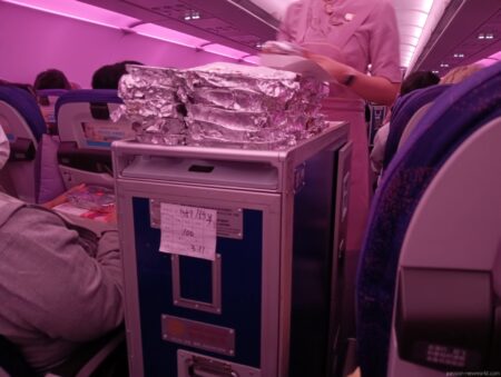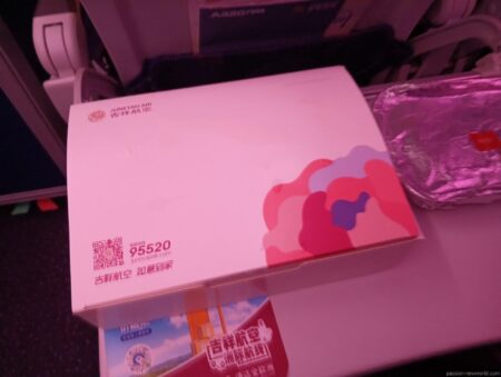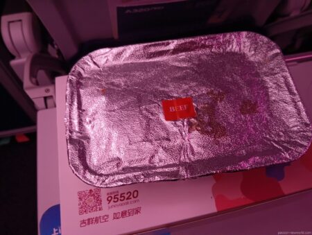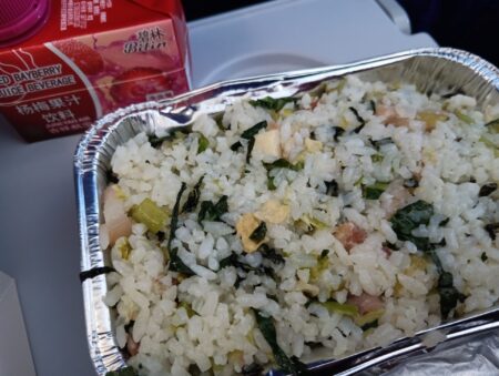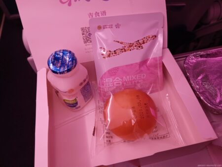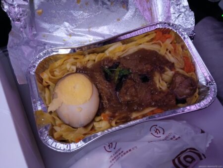 離陸後、ほどなくして運ばれてきた機内食。LCCに慣れているとけっこう新鮮な光景だ。中身はどんなメニューだろう?