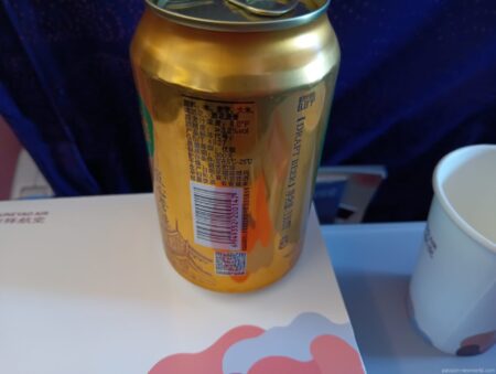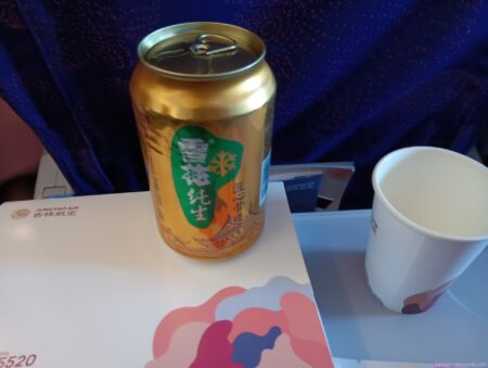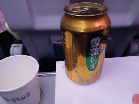CAさんにおずおずと「ビールありますか?」と聞くと「有」。運ばれたのが「雪花純生」。アルコール度数は3.1%以上と軽め。