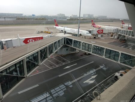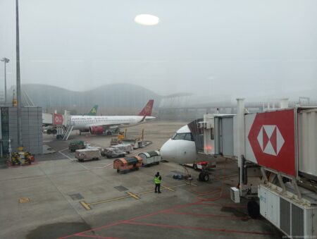 午前7時前。夜が明けて空港に朝もやがかかっている。