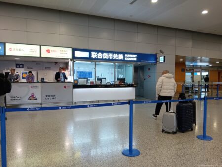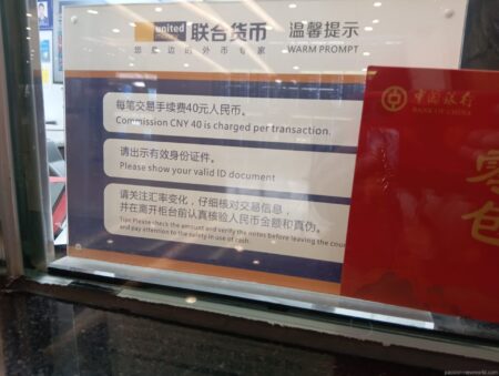 交換手数料は一律40元。日本円で800円近くもかかるので2000円を両替すると半分近くが手数料になってしまう。これはかなり不利な条件。日本国内のチケットショップなどであらかじめ人民元を入手しておいた方がよい。