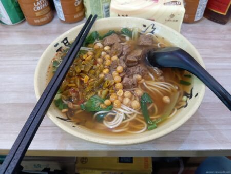 牛肉麺を注文。スープはあっさり目だ。揚げ玉がプチプチと口の中で弾ける触感がたまらない。日本円で500円ほど。