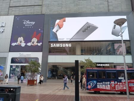 韓国サムスン電子のスマホ・ギャラクシーの大広告。隣はディズニーストア。