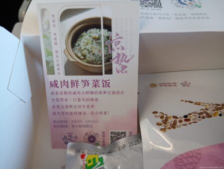 機内食2回目。塩味の豚肉と旬のタケノコごはん。
