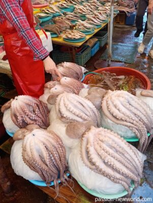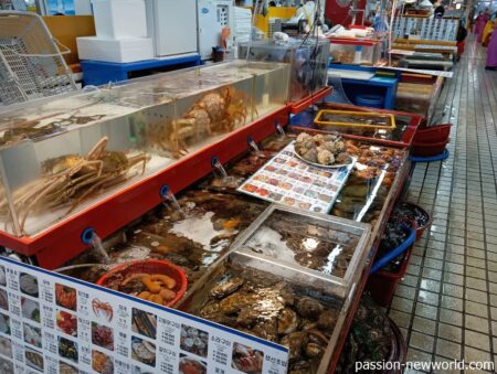 ただし、屋内店舗は海鮮そのものは割高でも野菜やおかず類をそろえてくれるサービスがある。お酒もビールや焼酎がある(1本各5000ウォン、500円)海鮮店舗=海鮮居酒屋という構図だ。これに対し屋外の店舗は自宅用にお持ち帰りが基本。ホテルで食べてもよいが後始末が大変だし、洗面所を汚すと迷惑がかかる。
